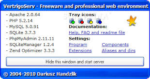 VertrigoServ foi desenvolvido para ser um pacote de instalação profissional e pequeno para Apache, PHPMySQL, SQLite, SQLiteManager, PHPMyAdmin e ZendOptimizer para a plataforma Windows. Com um instalador tudo-em-um, todos os componentes serão instalados em seus respectivos diretórios e poderão ser imediatamente usados após o término da instalação. O software também possui um desinstalador que remove todos os componentes de VertrigoServ do disco rígido.